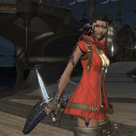 Orientation: PanDarma is the head of security/enforcement and personal bodyguard for Ban. The daughter of a pirate and a merchant's daughter from Ul'dah she was unplanned and left to basically raise herself. Her home wasn't an abusive one yet she was an inconvenient reminder of her mother's indiscretion and bad judgment, so she was left on her own and more often than not found that trouble was more entertaining than being a well behaved young lady. Some of that trouble lead her to find a scrawny little Au'Ra boy who had been badly beaten up when he failed a pickpocket attempt. She is his oldest friend and second in command.