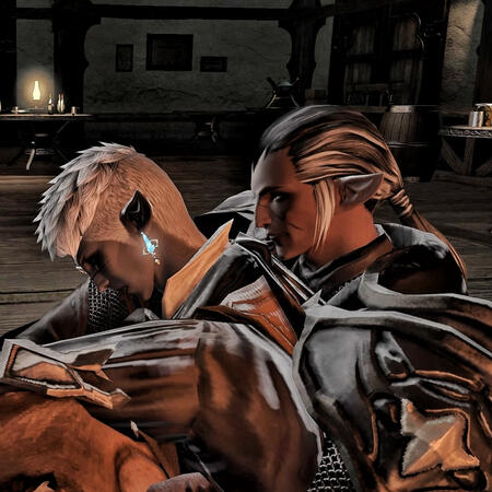 Race: Wildwood/Duskwight ElezenBorn from an affair between an Ishgardian Wildwood nobleman and a Duskwight servant in an attempt to have a male child to become his heir to the Auclair House, Beauregard was raised never knowing of his mixed blood and was ever the dutiful son. The woman he called "mother" never grew to love him but never rejected his "birthright", his father was distant and paranoid most of his life.Once Beauregard learned of his heritage, he decided to earn his right to lead his house and went to serve as a soldier, quickly rising in the ranks. All his hard work was lost in one moment t of weakness blended with drunken decisions. A beautiful Keeper woman, Nuray, wandered across him on one of his patrols, between her secretly decaying mental state and his inebriated choices the two shared one night and she became pregnant.The Auclairs became aware of this when Beauregard asked to either bring her to live with them at least long enough to have their child or to be free to go to her people for the same purpose. Instead of acceptance he wa met with an ultimatum, kill her and the child or all three would be killed in order to avoid a scandal. Neither was acceptable to Beau and he left to find a way to avoid it. Telling Nuray to flea to her home where he woild come find her and be a proper father somehow. This also wasn't meant to be, Nuray knew her people would never accept a mixed race child, so she hid in the wilderness until she gave birth on a dangerously cold storming night only to abandon the child at the gates of Camp Dragonhead.Word of this never reached Beauregard in all the time he was searching for the mother and his child. All he knew was that Nuray had been found dead in the woods without the child. He was told the child had been killed along with the mother. The few who knew of the scandal made it clear Beauregard was unwelcome in Ishgard and went as far as to label him a heretic.Living the life of a mercenary beside his young lover, Sylvien Ironheart, he avoided his home for years up until he received a missive from Haurchefant. This letter changed his life when he found out his son had been alive the whole time and needed his father now more than ever. He now works to build a relationship with is son and enjoy his lover and their life together.